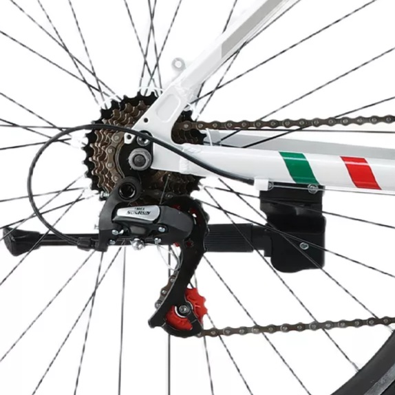 در بخش دنده و انتقال قدرت، شاهد استفاده از برند Sunrun هستیم. این دوچرخه دارای سیستم 21 سرعته (3 طبق جلو + 7 خودرو عقب) با عملکرد دقیق Index است. این سیستم تعویض دنده نرم و روانی را حتی در مسیرهای پرشیب تضمین میکند.